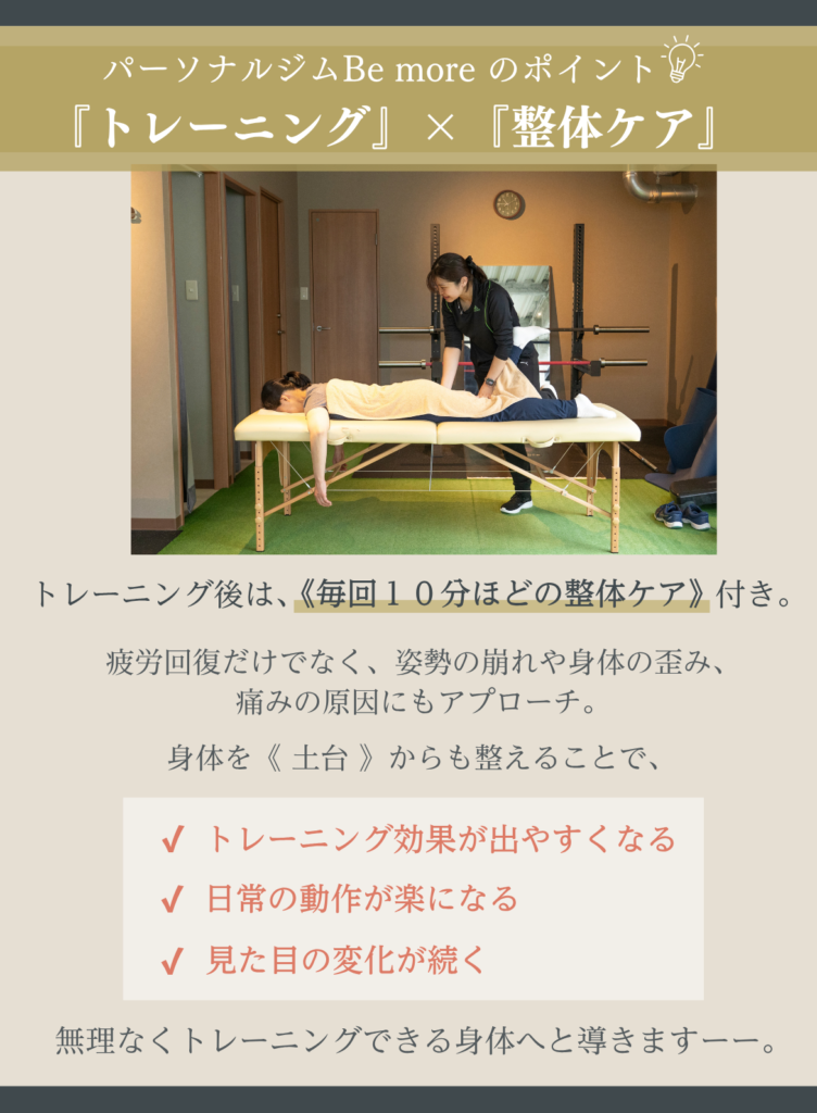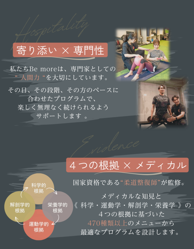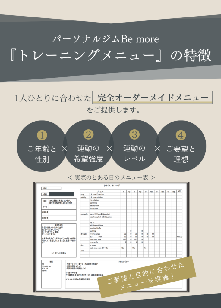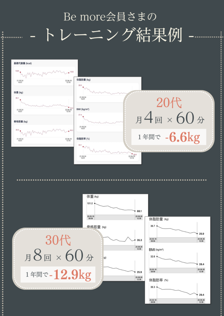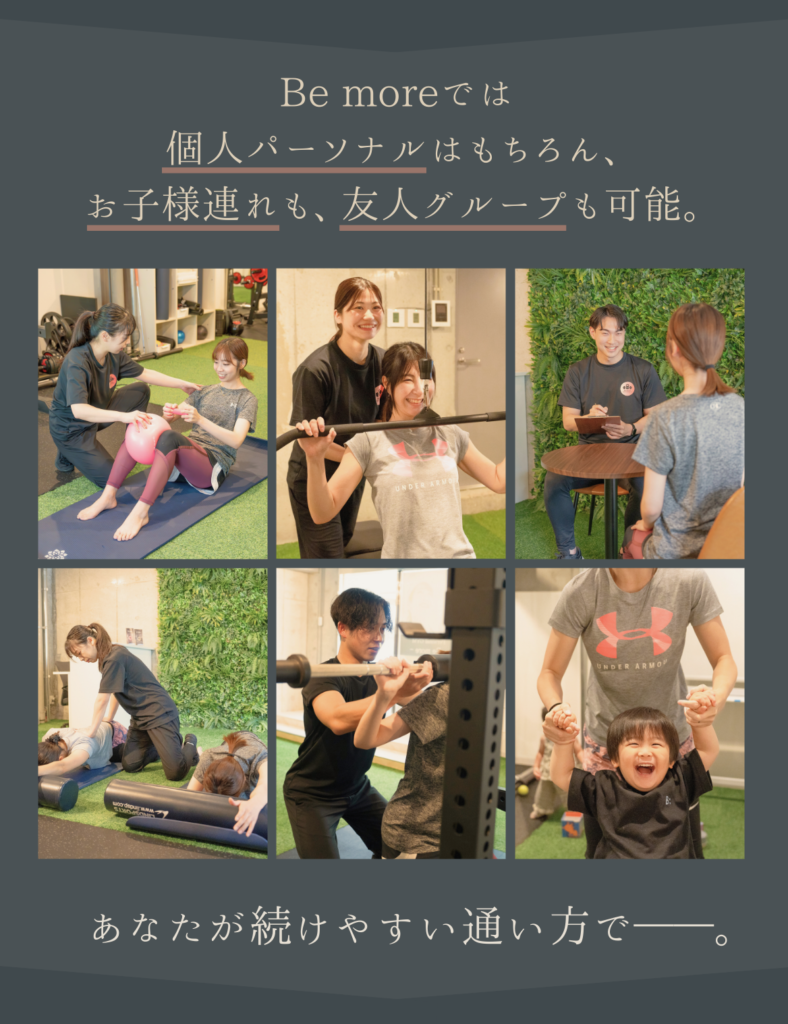 poop oppo 2022.10.20. いつも楽しいトレーニングをありがとうございます! 駐車場も完備なので、雨の日も安心して通うことができます。 トレーニングのバリエーションも豊富なので、身体全体の調子が良くなってきているのを実感します。 特にこの3ヶ月で体重も体脂肪率も落ちてきて、家族や職場の同僚にも体型が変わったねと言われるようになりました!! より引き締まった身体を目指して、 これからも頑張ります。 h_m 2022.09.11. 何年間も運動を全くしない生活が続き、身体がどんどん硬くなっていき、筋力も低下していることに危機感を抱き入会を決めました。 特に硬い股関節と背中の柔軟性の向上と身体全体の筋力アップをめざしてトレーニングを開始しました。 最初はストレッチの動きひとつひとつをこなすことがきつくて大変でしたが、ものすごく身体の硬い私でも、少しずつ柔らかくなっているのを実感し、とても嬉しく思っています。 通りに面した明るい店内で、トレーナーさんのきめ細やかなご指導のもと、気持ちよくトレーニングできます。皆さんにおすすめしたいジムです。 もちまる 2022.08.30. もともと側彎症があり、背筋をつけるように整形外科の先生から言われていました。 ジムなどでトレーニングしても逆に腰が痛くなってしまったり、忙しさを理由に続けられなかったりでした。 しかしこちらに入会して、パーソナルトレーニングを受けてからというもの、お陰様で腰痛はほぼ無くなり、周りからも身体が引き締まったと褒められることも増え、効果を実感しております。 スタッフの皆さんはいつも温かい笑顔で迎えてくださり、とても居心地が良いです。 ここは自分の身体にあったメニューをじっくりと考えてくださり、的確にアドバイスしてくださるので安心してお任せできます。 自分の身体をもっと好きになれるように、これからもBe moreさんで磨き続けたいと思います!! C T 2022.08.15. 30代男性です。 現在通い始めてから3ヶ月程経っています。 定期的にサッカーをしていますが、年齢的に走れなくなってきたこともあり、パフォーマンス向上を目的に通い始めました。 動ける体を目指して、ストレッチ、トレーニングを継続的に指導してもらっていますが、以前はサッカーをした翌日には毎回筋肉痛となっていたところ、通い始めてから1ヶ月後にはサッカーやフットサルをした後にほとんど筋肉痛にならなくなりました。 また、捻挫を何度もして足首が弱っているため、サッカーをすると足首を捻ったり痛くなることがあったのですが、足首の不安定さを感じなくなり、痛みも出なくなりました。 パフォーマンスについても、サッカーの試合中、後半には体がきつくて走れなくなっていたところ、足が動くようになり、一試合を通してプレーできるようになってきました。 以前、ジムに通ってトレーニングをしていた時期もありましたがあまり体の変化を感じなかったところ、マンツーマンで的確なトレーニングをしてもらえることで少しずついい方向に体の変化が出てきているのを感じ、サッカーをすることがますます楽しみになっています。 Keiko 2022.08.11. 5月から週1回、通い始めています。 60代を目前に控え、仕事も忙しく、コロナ禍で巣ごもり生活で、身体の不調が気になりだしました。 体重増加、股関節や肩の痛みなどなど問題ばかりで、初めてジムに通うことを決めました。身体の様子や弱い所を見極めていただきながら、指導して頂き、身体の変化を実感しています。 トレーニングの際、同じ内容でも少しずつ負荷をかけてもらうことで、強度が変わり効果倍増、励まして頂きながら、続けることができてます。 トレーニング後のマッサージも最高です。 パーソナルトレーニング、おすすめです。無料駐車場もあり、車でも通いやすいです。 YUKA 2022.08.06. 30代に突入してから、体型の変化や健康面が気になるようになり、今回初めてジムに通うことを決意しました。 最初は、ゴリゴリのムキムキマッチョなスパルタお兄さんが担当だったらどうしようかと不安でしたが、Be moreのトレーナーさんは皆さんとても優しくて、アットホームな雰囲気でいつも明るく迎えてくれるので、私みたいなパーソナルジム初心者の方や女性の方にもすごくオススメです。 日頃全く運動をしてこなかったので、初めは自分の体力の無さに愕然としましたが、通い始めて数ヶ月、様々な変化がありました。 慢性化していた肩凝りや腰痛が、いつのまにか楽になっていたこと。姿勢が良くなったこと。体が引き締まってきて、痩せたね、とよく言ってもらえるようになったこと。 変化が目に見えてくると、モチベーションも上がり、食事も気をつけるようになりました。 トレーニングの際、言われた通りにほんの少ーし、体の向きを変えるだけで一気にキツさが変わったりします。プロのトレーナーさんって本当に凄いなぁと思います。そういう細かな指導で正しく、効率よく、鍛えることが出来るので最高