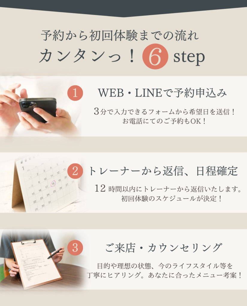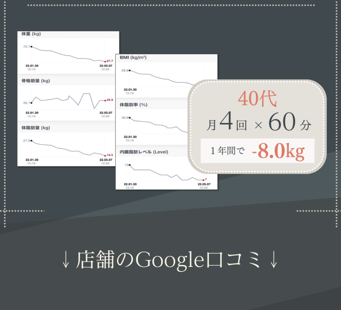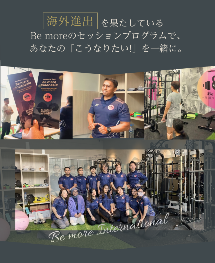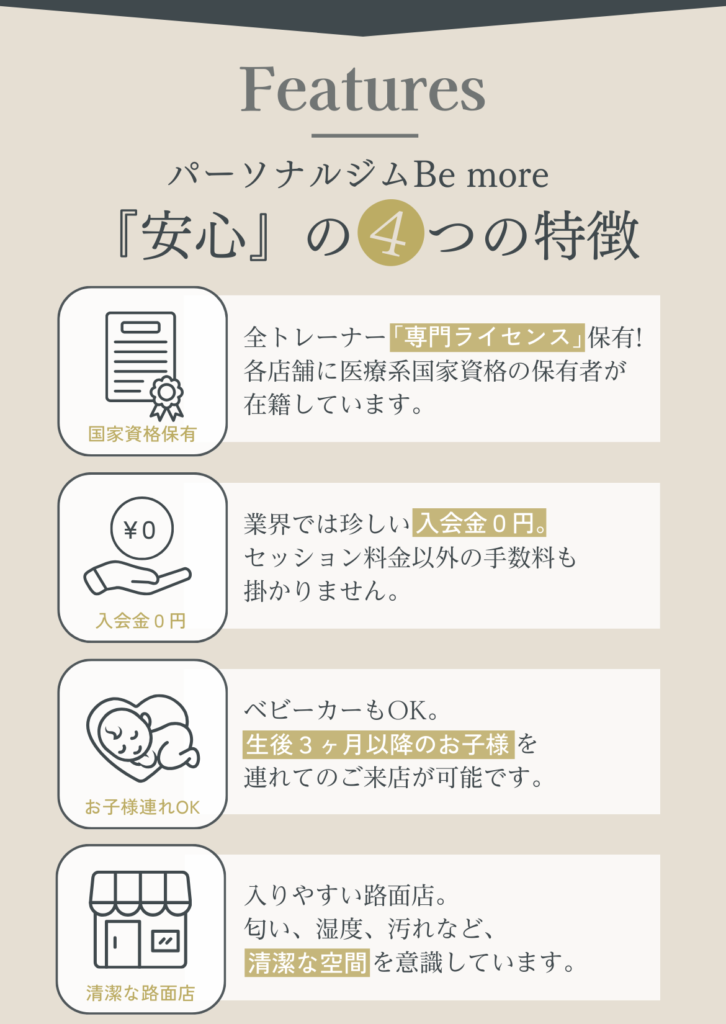 poop oppo 2022.10.20. いつも楽しいトレーニングをありがとうございます! 駐車場も完備なので、雨の日も安心して通うことができます。 トレーニングのバリエーションも豊富なので、身体全体の調子が良くなってきているのを実感します。 特にこの3ヶ月で体重も体脂肪率も落ちてきて、家族や職場の同僚にも体型が変わったねと言われるようになりました!! より引き締まった身体を目指して、 これからも頑張ります。 h_m 2022.09.11. 何年間も運動を全くしない生活が続き、身体がどんどん硬くなっていき、筋力も低下していることに危機感を抱き入会を決めました。 特に硬い股関節と背中の柔軟性の向上と身体全体の筋力アップをめざしてトレーニングを開始しました。 最初はストレッチの動きひとつひとつをこなすことがきつくて大変でしたが、ものすごく身体の硬い私でも、少しずつ柔らかくなっているのを実感し、とても嬉しく思っています。 通りに面した明るい店内で、トレーナーさんのきめ細やかなご指導のもと、気持ちよくトレーニングできます。皆さんにおすすめしたいジムです。 もちまる 2022.08.30. もともと側彎症があり、背筋をつけるように整形外科の先生から言われていました。 ジムなどでトレーニングしても逆に腰が痛くなってしまったり、忙しさを理由に続けられなかったりでした。 しかしこちらに入会して、パーソナルトレーニングを受けてからというもの、お陰様で腰痛はほぼ無くなり、周りからも身体が引き締まったと褒められることも増え、効果を実感しております。 スタッフの皆さんはいつも温かい笑顔で迎えてくださり、とても居心地が良いです。 ここは自分の身体にあったメニューをじっくりと考えてくださり、的確にアドバイスしてくださるので安心してお任せできます。 自分の身体をもっと好きになれるように、これからもBe moreさんで磨き続けたいと思います!! C T 2022.08.15. 30代男性です。 現在通い始めてから3ヶ月程経っています。 定期的にサッカーをしていますが、年齢的に走れなくなってきたこともあり、パフォーマンス向上を目的に通い始めました。 動ける体を目指して、ストレッチ、トレーニングを継続的に指導してもらっていますが、以前はサッカーをした翌日には毎回筋肉痛となっていたところ、通い始めてから1ヶ月後にはサッカーやフットサルをした後にほとんど筋肉痛にならなくなりました。 また、捻挫を何度もして足首が弱っているため、サッカーをすると足首を捻ったり痛くなることがあったのですが、足首の不安定さを感じなくなり、痛みも出なくなりました。 パフォーマンスについても、サッカーの試合中、後半には体がきつくて走れなくなっていたところ、足が動くようになり、一試合を通してプレーできるようになってきました。 以前、ジムに通ってトレーニングをしていた時期もありましたがあまり体の変化を感じなかったところ、マンツーマンで的確なトレーニングをしてもらえることで少しずついい方向に体の変化が出てきているのを感じ、サッカーをすることがますます楽しみになっています。 Keiko 2022.08.11. 5月から週1回、通い始めています。 60代を目前に控え、仕事も忙しく、コロナ禍で巣ごもり生活で、身体の不調が気になりだしました。 体重増加、股関節や肩の痛みなどなど問題ばかりで、初めてジムに通うことを決めました。身体の様子や弱い所を見極めていただきながら、指導して頂き、身体の変化を実感しています。 トレーニングの際、同じ内容でも少しずつ負荷をかけてもらうことで、強度が変わり効果倍増、励まして頂きながら、続けることができてます。 トレーニング後のマッサージも最高です。 パーソナルトレーニング、おすすめです。無料駐車場もあり、車でも通いやすいです。 YUKA 2022.08.06. 30代に突入してから、体型の変化や健康面が気になるようになり、今回初めてジムに通うことを決意しました。 最初は、ゴリゴリのムキムキマッチョなスパルタお兄さんが担当だったらどうしようかと不安でしたが、Be moreのトレーナーさんは皆さんとても優しくて、アットホームな雰囲気でいつも明るく迎えてくれるので、私みたいなパーソナルジム初心者の方や女性の方にもすごくオススメです。 日頃全く運動をしてこなかったので、初めは自分の体力の無さに愕然としましたが、通い始めて数ヶ月、様々な変化がありました。 慢性化していた肩凝りや腰痛が、いつのまにか楽になっていたこと。姿勢が良くなったこと。体が引き締まってきて、痩せたね、とよく言ってもらえるようになったこと。 変化が目に見えてくると、モチベーションも上がり、食事も気をつけるようになりました。 トレーニングの際、言われた通りにほんの少ーし、体の向きを変えるだけで一気にキツさが変わったりします。プロのトレーナーさんって本当に凄いなぁと思います。そういう細かな指導で正しく、効率よく、鍛えることが出来るので最高